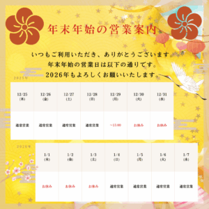年末年始の営業スケジュールにつきまして、下記の通りご案内いたします。